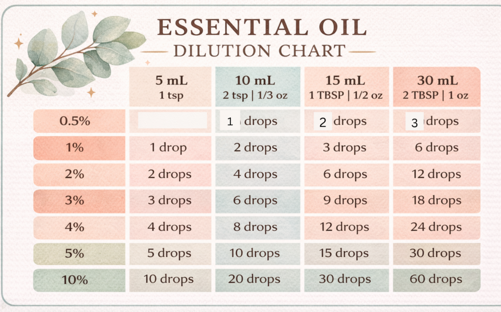 Please use the chart and the animal guidelines on the right to figure out how much to dilute based on type and size of pet and size of bottle that you are using. After you add the number of drops of essential oil to your bottle, then fill the rest of the way with your fractionated coconut oil