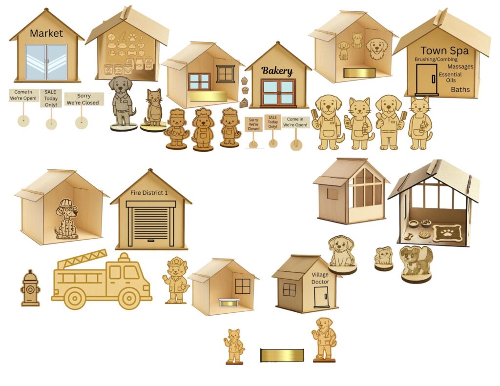 Each building and character is laser cut and engraved on wood, creating an imaginative world where cats and dogs run their own bakery, pet shop, fire station, veterinary office — and even live in their own cozy house.